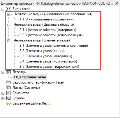 Через стартовое окно можно сразу попасть в выбранный раздел (чертежный вид). Структура видов разделена по категориям семейств, как показано на рис. 2.