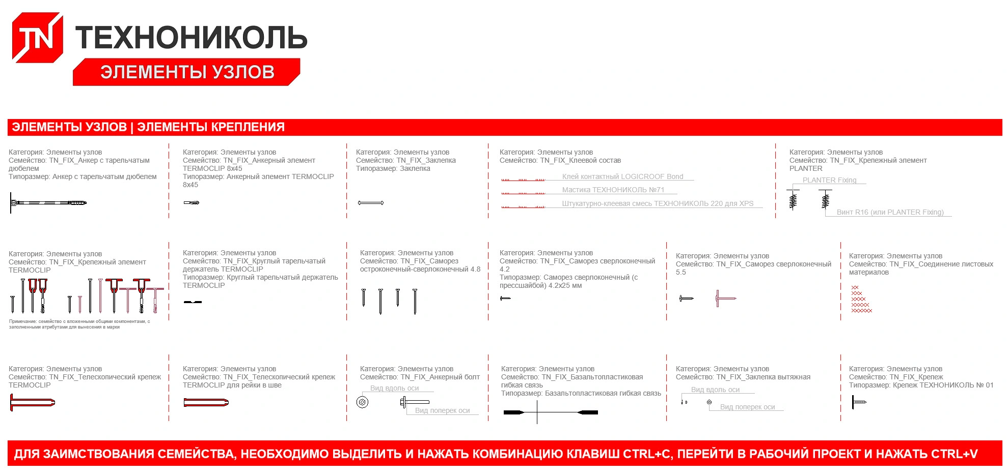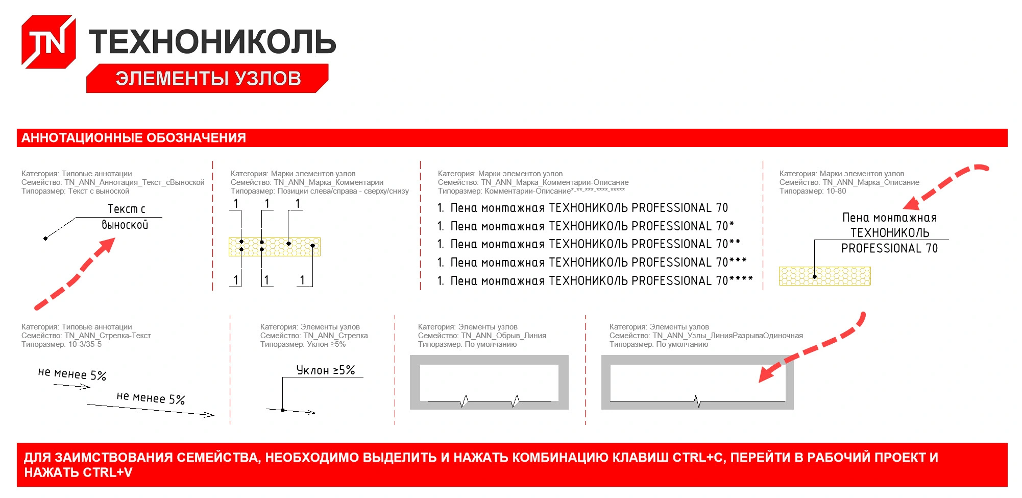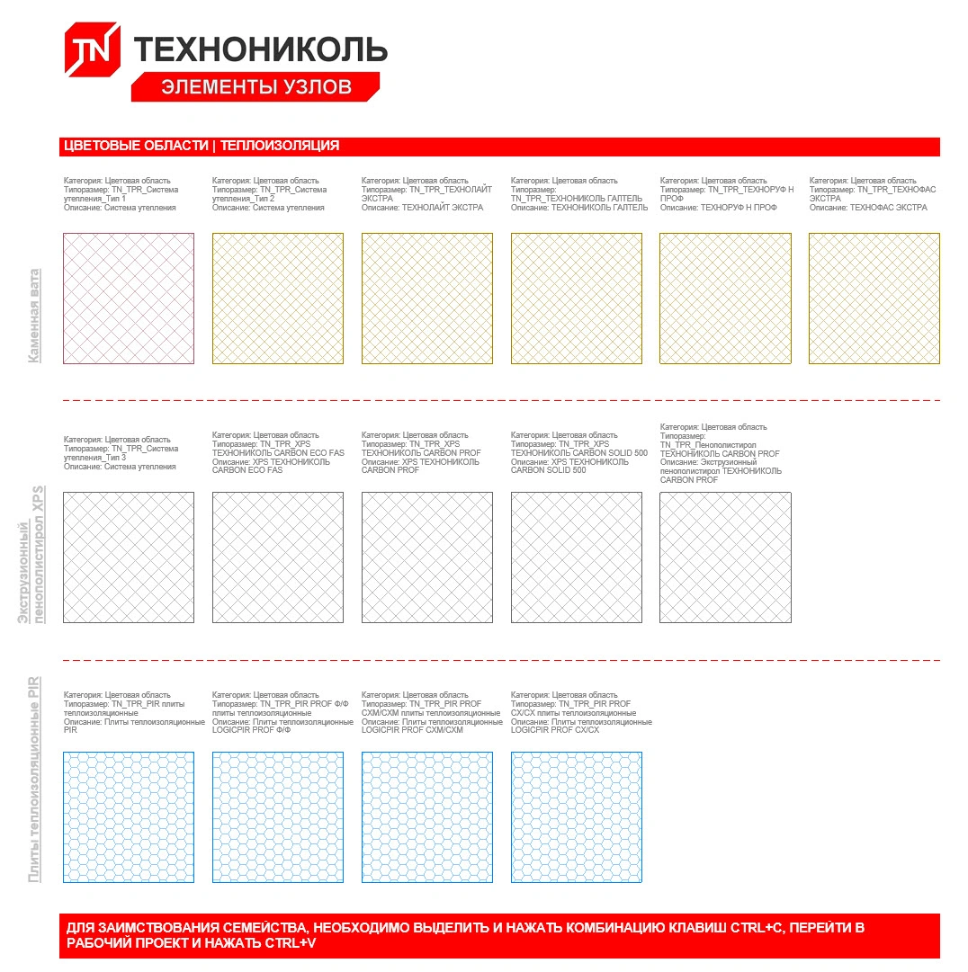 Представленный каталог содержит элементы узлов, аннотационные обозначения и цветовые области, компании ТЕХНОНИКОЛЬ, предназначенные для создания 2D – узлов.