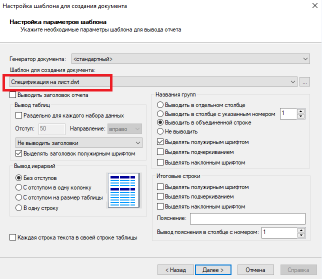 Укажите шаблон для вывода Спецификация на лист на последнем шаге вставки спецификации на лист таблицей Нанокад (Рис.10).