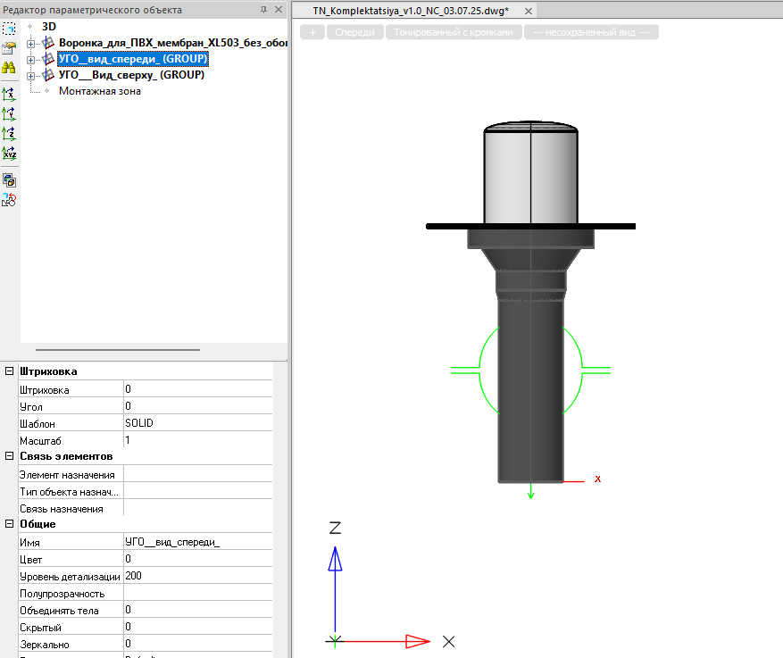 Каждый трехмерный объект в составе параметрического оборудования имеет УГО (рис.6). Использование УГО элемента на проекциях определяется параметром «Уровень детализации», для Вида спереди – 200, для Вида сверху – 100. Уровень детализации трехмерного объекта – 500.