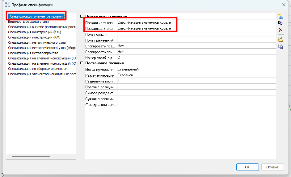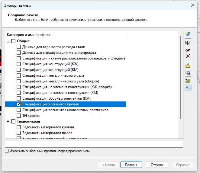 Для вывода спецификации используйте в экспорте данных отчет Спецификация элементов кровли (Рис.8).
