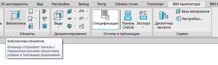 На ленте во вкладке «BIM Архитектура» → панель «Объекты» выбрать команду «Библиотека»;