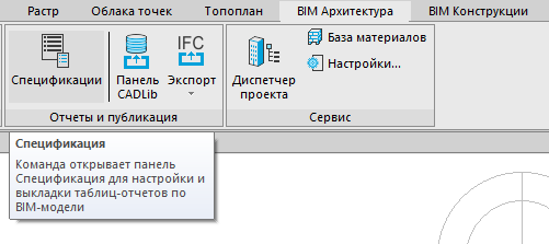 Во вкладке «BIM Архитектура» на панели «Отчеты и публикации» выбрать команду «Спецификатор»;