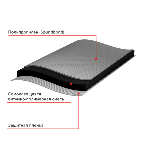 Зоны перехлестов материала перед склейкой обрабатываются битумной мастикой (битумным праймером на водной основе/латексным грунтом) в зависимости от типа конструкции пола и согласно инструкции по применению. Материал не предназначен для наплавления. Материал не предназначен для гидроизоляции душевых и бассейнов с укладкой плитки на материал, без устройства защитной цементно-песчаной стяжки.