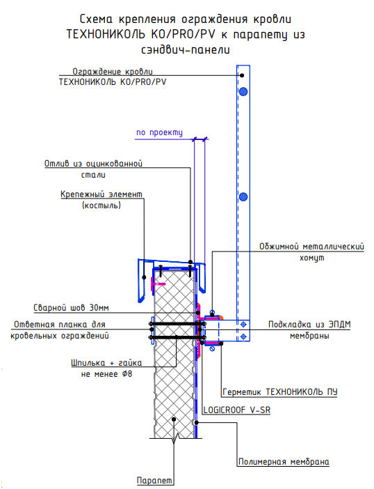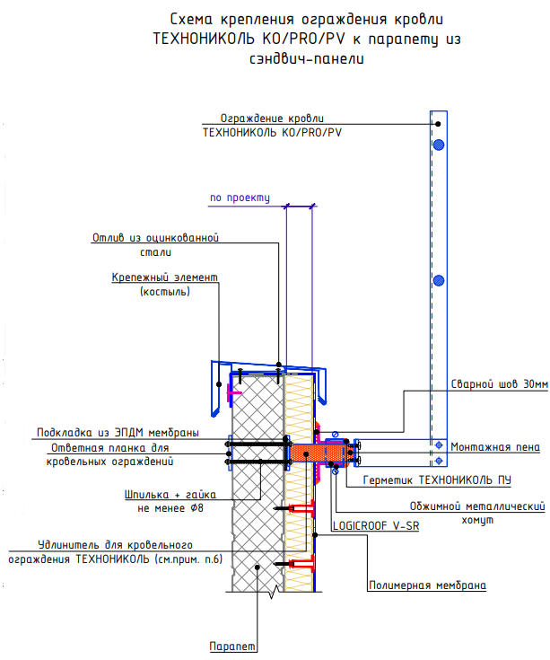 Крепление кровельного ограждения ТЕХНОНИКОЛЬ в парапет из сэндвич-панели