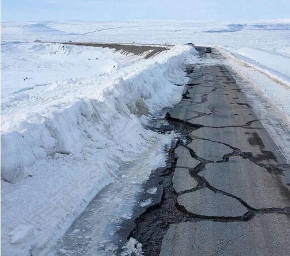 Развитие таких опасных явлений, как бугры пучения и термоэрозия, может разрушить даже хорошо армированные конструкции. Часто наблюдаются случаи образования несквозных таликов — локальных участков глубокого многолетнего оттаивания внутри мерзлой толщи, либо, наоборот, новообразование мерзлой толщи. В любом из этих случаев изменяется структура грунтового основания и появляются не всегда предсказуемые и контролируемые деформации. Наглядное представление о масштабе этих проблем дают видимые деформации дорожного полотна, регулярно возникающие в северных регионах (рис. 2).