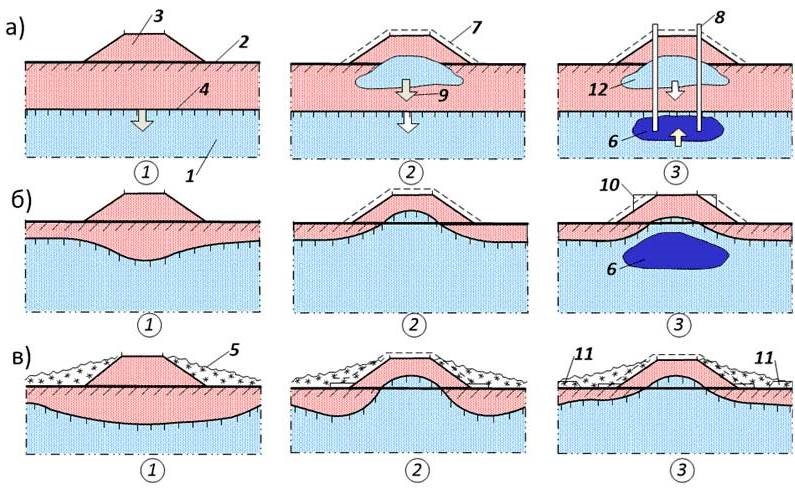 Рисунок 6. Принципиальные схемы, характеризующие эффективность сочетания мероприятий: а) сочетание теплоизоляции с глубинным охлаждением; б), в) – сочетание теплоизоляции с поверхностным охлаждением; (1), (2), (3) – мерзлое состояние без мероприятий, с теплоизоляцией, в сочетании; 1 – грунт основания, 2 – естественная поверхность грунта, 3 – тело насыпи, 4 – верхняя граница мерзлоты, 5 – поверхность снежных отложений, 6 – область с пониженной температурой, 7 – теплоизоляция, 8 – термостабилизаторы, 9 – направление перемещения границы мерзлоты, 10, 11 – соответственно верхняя и нижняя боковая площадка, состоящая из габионов, 12 – область новообразования мерзлоты
