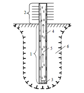 Рисунок 5. Принципиальная схема вертикального парожидкостного термостабилизатора (1 – испаритель, 2 – конденсатор, 3 – жидкий теплоноситель (хладагент), 4 – пленка конденсата, 5 – парообразный хладагент, 6 – замороженный грунт)