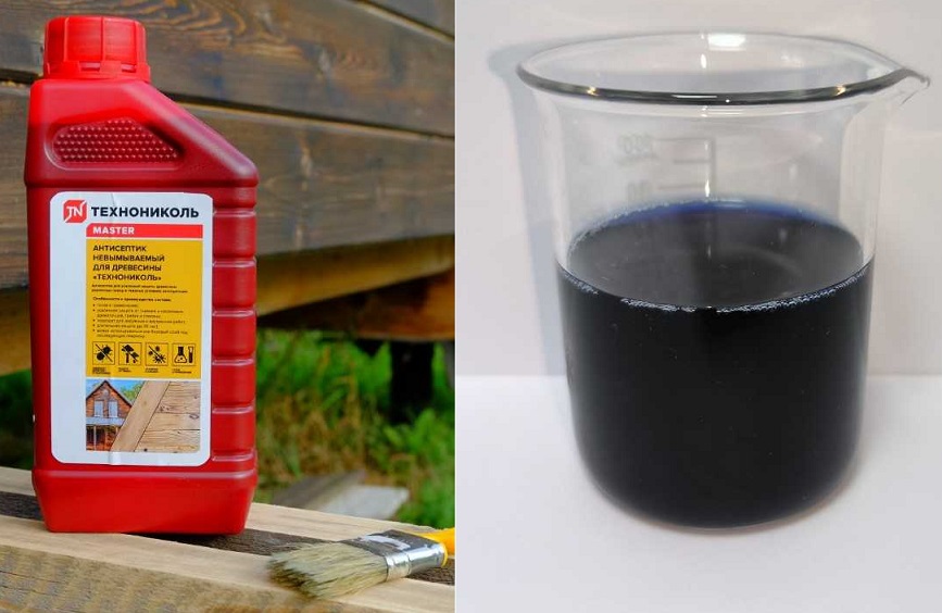 Характерный фисташковый оттенок на древесине обеспечивает визуальный контроль качества нанесения, исключает вероятность пропусков при обработке поверхностей. Сам состав представляет из себя однородную полупрозрачную жидкость синего цвета.