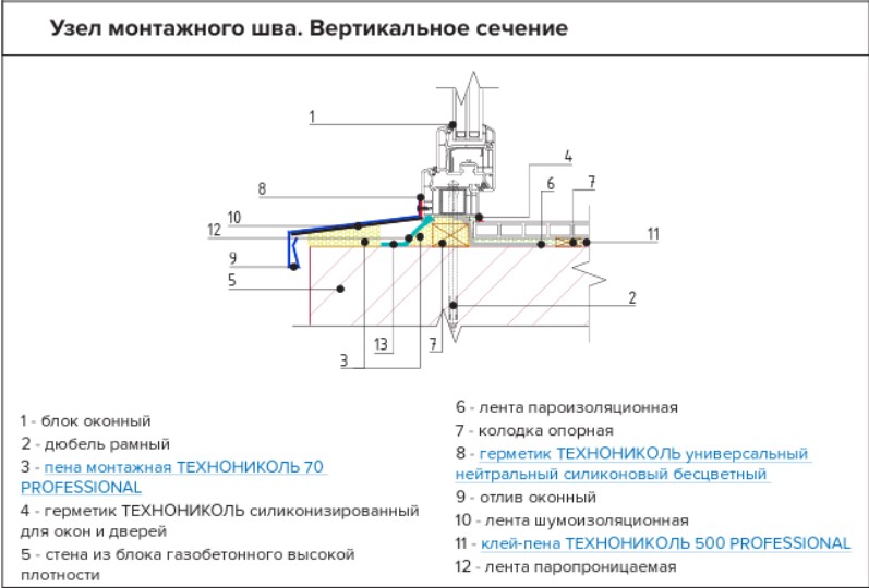 Рис. 4. Пример узла монтажного шва с соблюдением нормативных требований для стены из газобетона