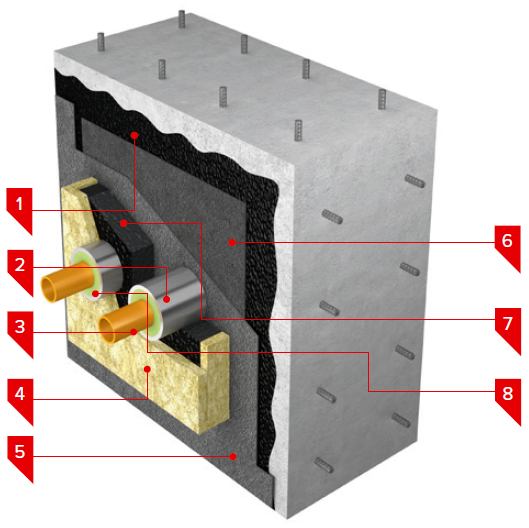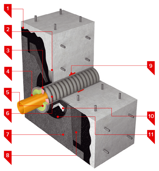 Герметизация рядомстоящих трубных проходок осуществляется с применением горячего герметика ТЕХНОНИКОЛЬ №42. Горячий герметик заливается в опалубку, которая изготавливается из подручных материалов. Толщина заливки составляет 25-50 мм.