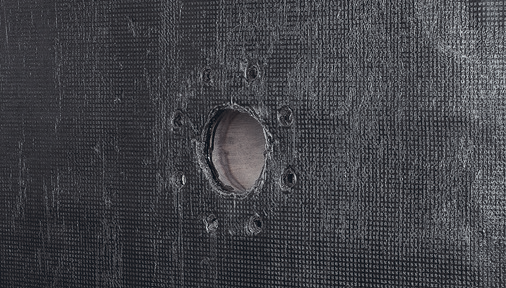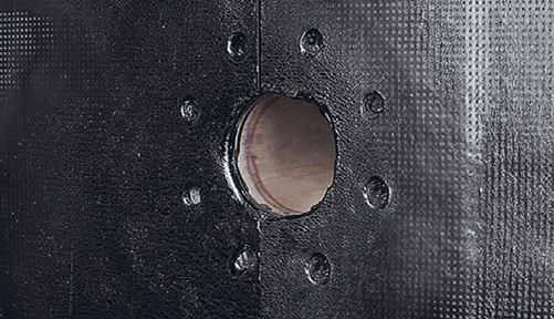 При обустройстве трубных проходок с применением материала Техноэласт Фундамент в два слоя рулоны первого слоя укладываются с вертикальным швом в районе трубной проходки. Отверстие под трубную проходку в рулоне второго слоя должно проходить по центру рулона.