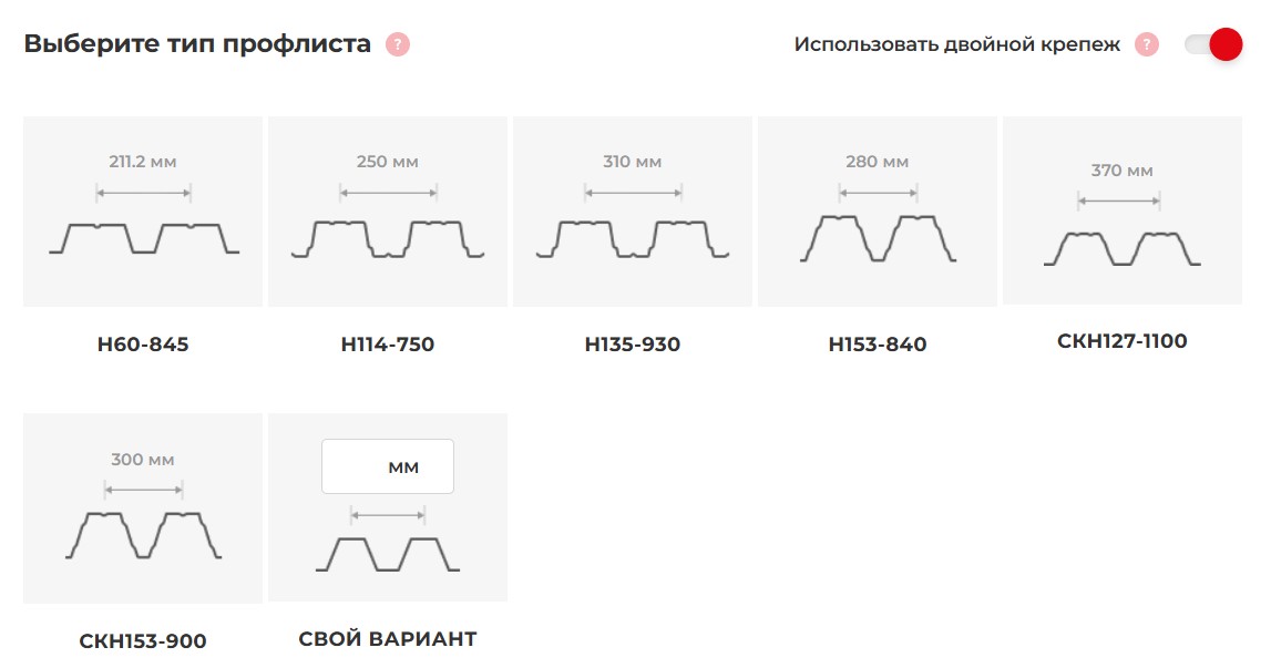 В этом же калькуляторе можно найти типы профлиста, подходящие под категорию «двойной крепеж» (даблфикс):