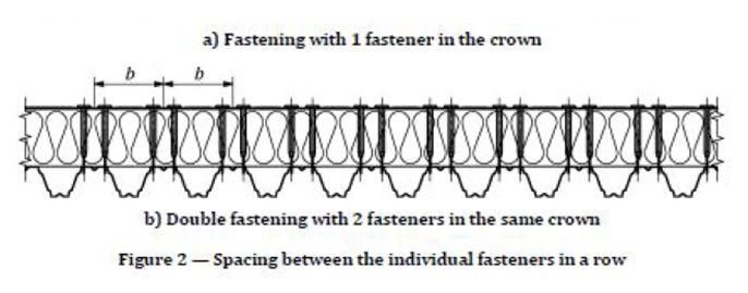 In the case of a structural deck of profiled metal the general recommendation is to install the fasteners in the crown, see Figure 2a. Double fastening with two fasteners in the same steel profile crown is considered as one fastener point, see Figure 2 b). The wind resistance strength for a double fastener should be tested according to EN 16002:2018. The use of double fastening in the same crown and the minimum distance between the fasteners which are placed in the same crown must be approved and specified by the manufacturer of the waterproofing system.