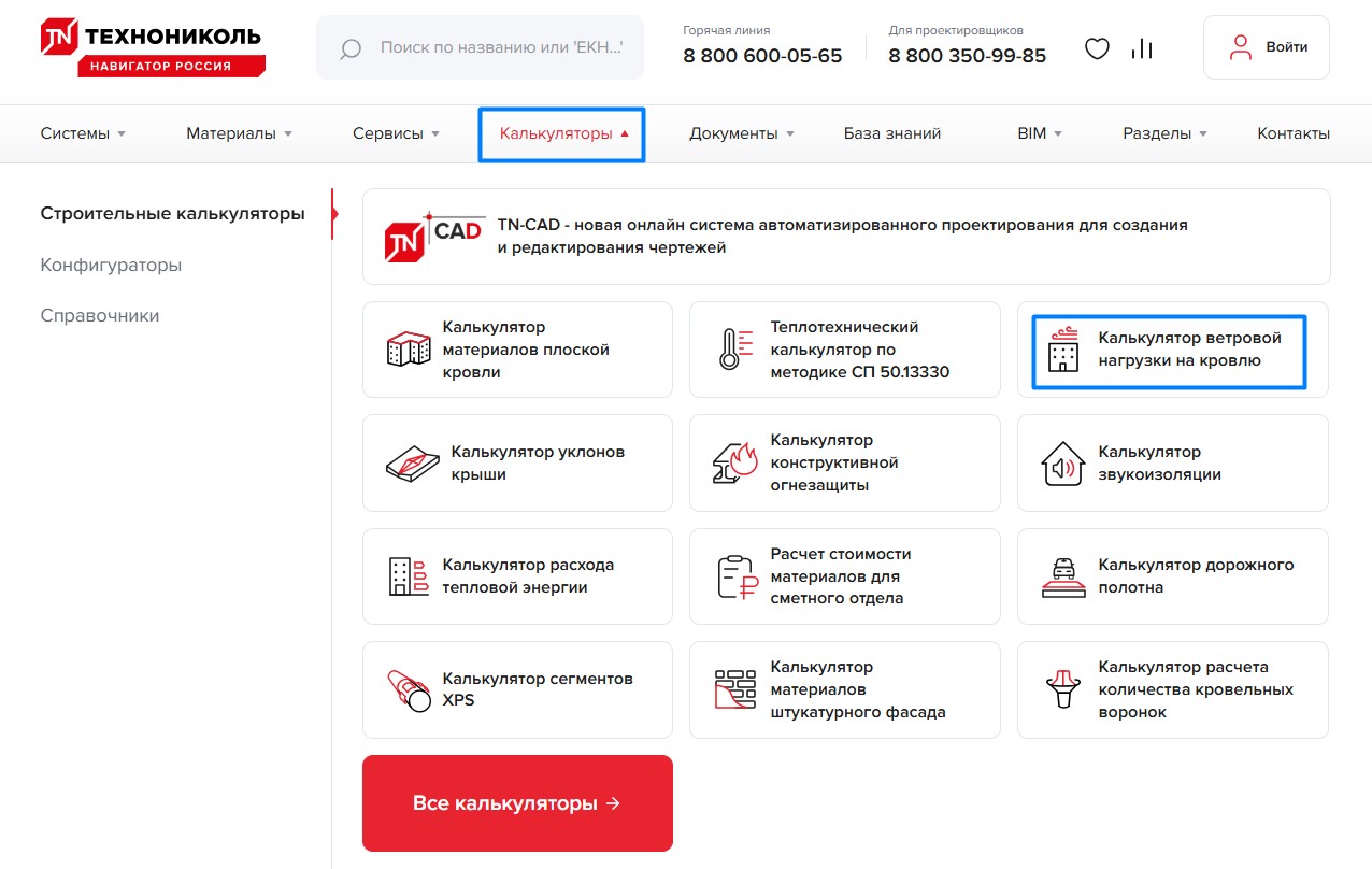 Расчет ветровой нагрузки на кровлю с обновленными параметрами крепежа можно выполнить в разделе «Калькуляторы». Для этого выбираем калькулятор ветровой нагрузки на кровлю: