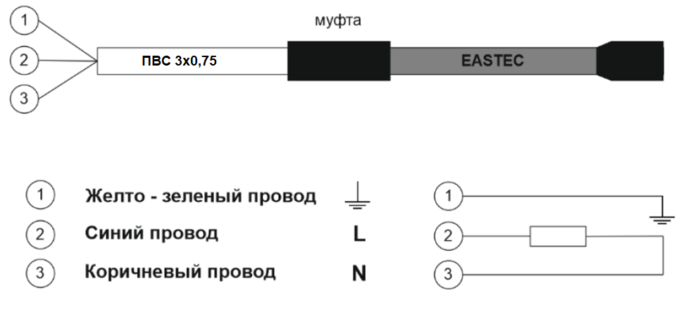 Длинна кабеля ПВС 3х0.75 - 1 метр. Греющий кабель находится внутри воронки и соединен с кабелем ПВС при помощи муфты (см. рис.).