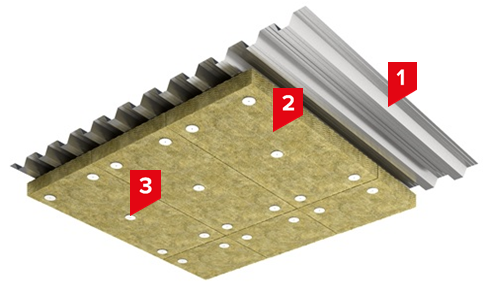 По смонтированному настилу из стальных профилированных листов устраивается кровельный пирог согласно проекту. Завершающим этапом является монтаж огнезащитного покрытия Плит ТЕХНО ОЗМ толщиной не менее 40 мм к нижнему поясу профнастила при помощи самосверлящих самонарезающих винтов и металлических шайб диаметром не менее 50 мм.
