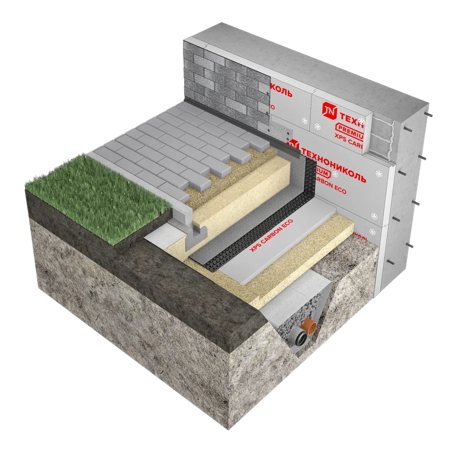 Рекомендуется использовать для утепления под отмостку экструзионный пенополистирол (ЭППС, XPS) ТЕХНОНИКОЛЬ CARBON — теплоизоляционный материал, который изготавливают с помощью экструзии из полистирола с добавлением газообразного порообразователя и технологических добавок. В некоторых источниках пенополистирол называют пенопластом и не разделяют эти материалы, что не корректно.