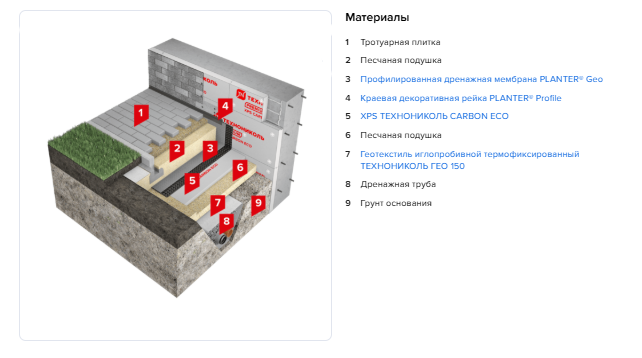 Материалы, которые потребуются для утепления дорожки вокруг дома: теплоизоляционные плиты XPS CARBON ECO, дренажные мембраны PLANTER geo, изоляционные ленты, планки для фиксации профилированной мембраны на цоколе