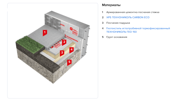 Высокая прочность на сжатие. Экструзионный пенополистирол обладает высокой прочностью на сжатие — не менее 200 кПа (20 т/м2) марка XPS ТЕХНОНИКОЛЬ CARBON ECO; прочностью на сжатие — не менее 250 кПа (25 т/м2) марка XPS ТЕХНОНИКОЛЬ CARBON PROF Это позволяет получить ровное и жесткое основание, что увеличивает срок эксплуатации всей системы. Материал не дает усадки со временем, не деформируется при движениях грунта, пешеходной нагрузке.