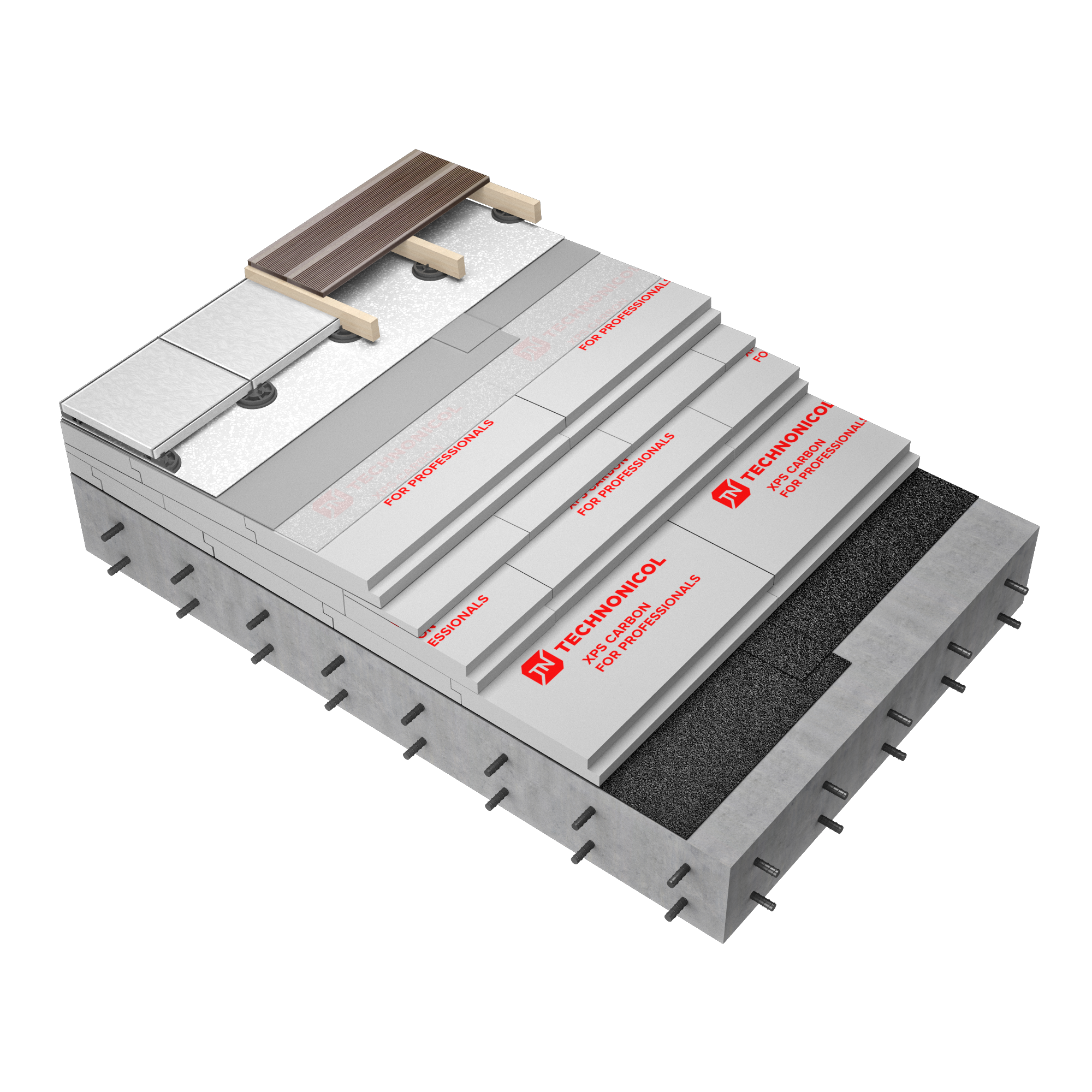 В системе ТН-КРОВЛЯ Терраса плиты из экструзионного пенополистирола укладываются свободно, теплоизоляционный слой фиксируется балластным эксплуатируемым слоем из тротуарных плиток, которые устанавливаются на регулируемые опоры.