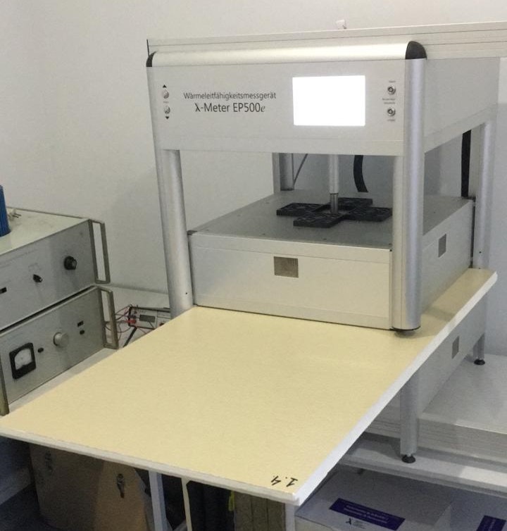 Испытания проводились на приборе для измерения теплопроводности Lambda-Meter EP500е (Германия), приобретенным НИИСФ РААСН в рамках программы Минстроя РФ в 2020 году, а также (параллельно) на отечественном приборе – Измеритель теплопроводности ИТП-МГ4 «250», который достаточно давно используется во многих лабораториях РФ. О некоторых различиях в результатах измерений теплопроводности PIR и их причинах на разных приборах отечественного производства рассказано в работе [9].