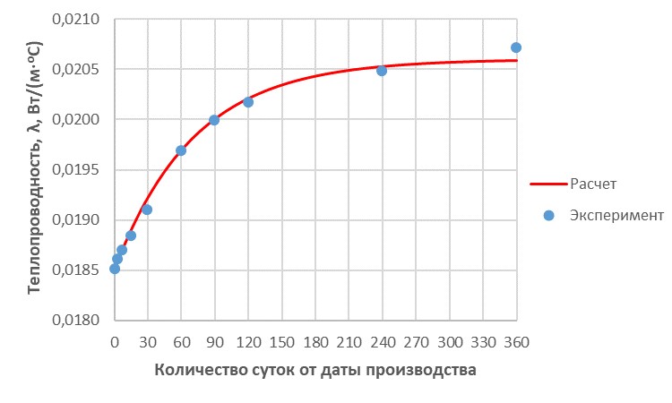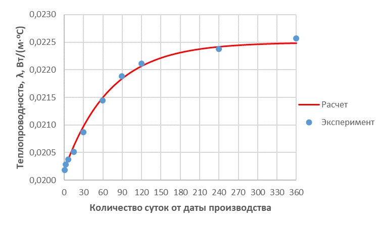 Как было отмечено во введении, теплопроводность пенополиизоцианурата (PIR) меняется с течением времени. Важной задачей для специалистов является определение теплопроводности газонаполненных полимерных теплоизоляционных материалов после прекращения процесса замещения газа, закачиваемого в поры при производстве, на воздух и установления постоянной концентрации газовой смеси в ячейках – установившейся теплопроводности. Этот процесс, в зависимости от ряда факторов, может занимать достаточно длительное время, поэтому практический интерес представляют ускоренные методы такого определения.