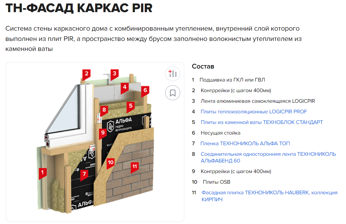 Примеры применения: система ТН-ФАСАД КАРКАС PIR для каркасных домов с заполнением внутреннего слоя стен панелями LOGICPIR PROF.