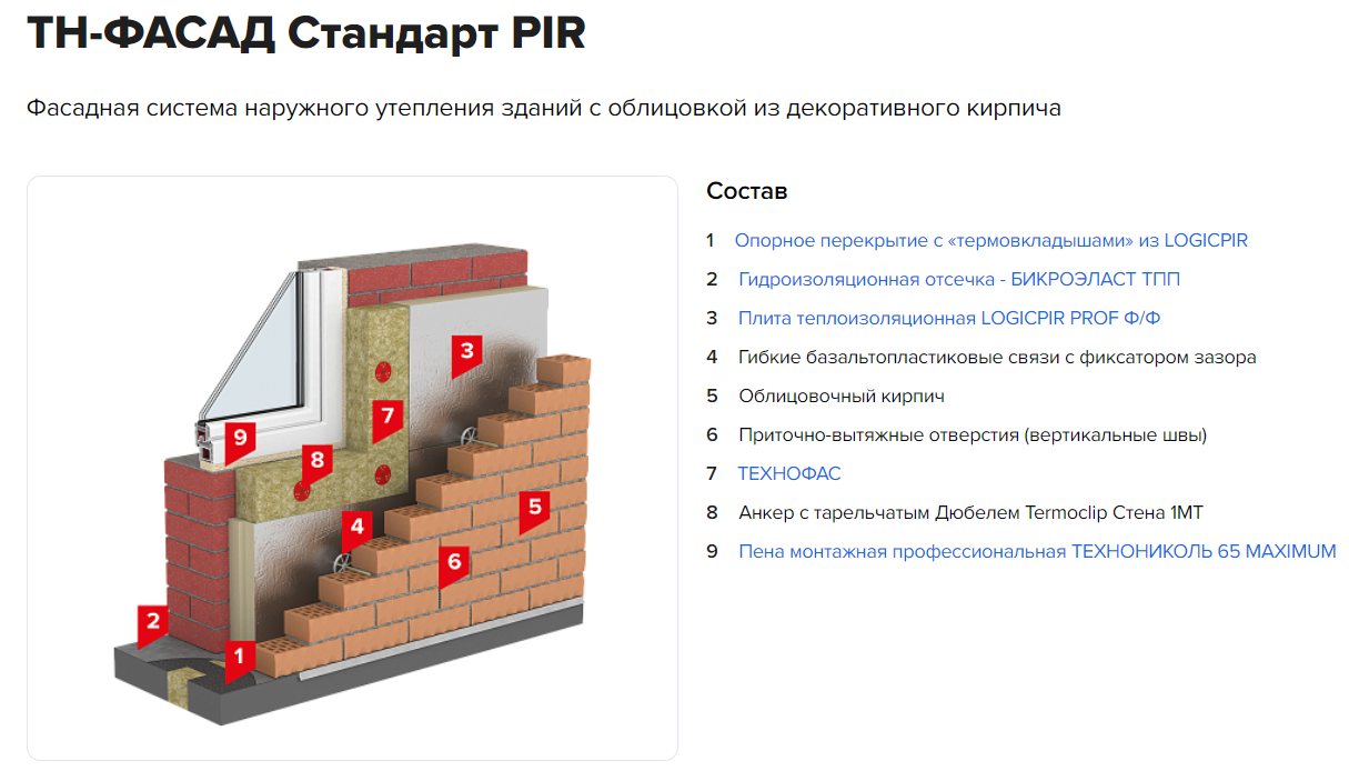 Примеры применения: в системе ТН-ФАСАД Стандарт PIR плиты LOGICPIR PROF Ф/Ф используются как внутренний теплоизоляционный слой в трехслойной (слоистой) кладке.