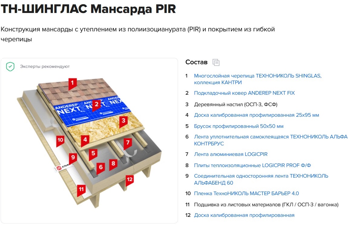 ТН-ШИНГЛАС Мансарда PIR — система утепления кровли, которая предусматривает обшивку мансарды большеформатными плитами LOGICPIR PROF Ф/Ф.