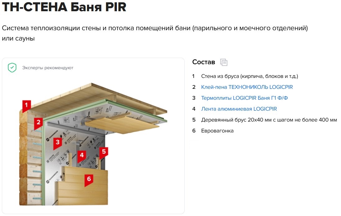 Пример применения: в парной термоплиты монтируют под вагонку, сокращая время прогрева в 2 раза. Монтаж материала в сауне или бане описывает система ТН-СТЕНА Баня PIR.