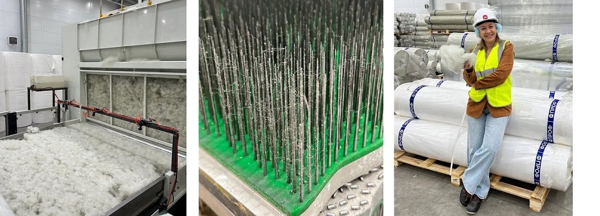 На заводе из тщательно подготовленного волокна формируют ткань иглопробивным способом: