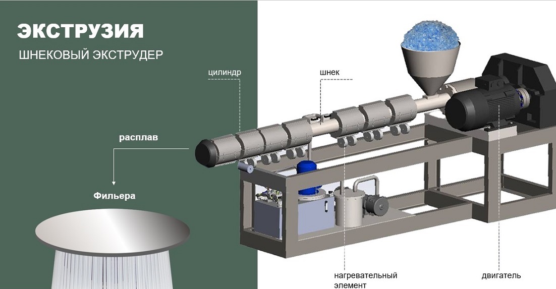 Формирование нитей. Расплав подается в фильеру — металлическую пластину с микроотверстиями. Через ее отверстия выдавливаются тонкие струйки расплава. Они охлаждаются воздухом и затвердевают, превращаясь в первичные полиэфирные нити.