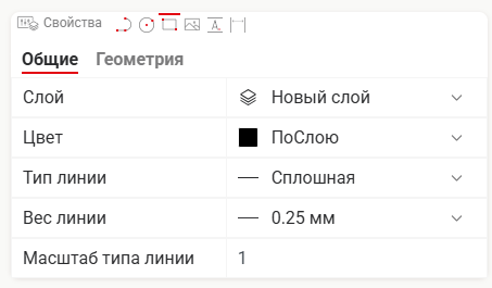Панель содержит основную информацию о выбранном элементе: слой, цвет, тип, вес линии и т.д. В зависимости от элемента панель свойств имеет разные разделы. Например, для полилинии характеристики сведены в разделы «Общие» и «Геометрия», для подложек добавляется раздел «Отображение». Пользователь может сам корректировать некоторые значения характеристик в панели свойств элемента. Например, можно перенести элемент в другой слой или отключить отображение. |