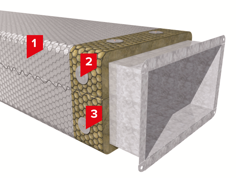 В качестве огнезащитного покрытия в системе ТН-ОГНЕЗАЩИТА Воздуховод применяется надежный, облегчающий монтаж и изящный по внешнему виду Мат Прошивной ТЕХНО 80 ГП (кашированный неармированной алюминиевой фольгой). Крепление прошивного мата ТЕХНО 80 ГП к воздуховоду может осуществляться как при помощи приварных штифтов и прижимных шайб, так и при помощи стальных бандажей и вязальной проволоки. Система ТН-ОГНЕЗАЩИТА Воздуховод виброустойчива и не разрушается во время работы системы вентиляции и кондиционирования, при этом кроме функции огнезащиты система выполняет функции тепло- и звукоизоляции. Огнестойкий воздуховод имеет предел огнестойкости (EI) от 30 до 240 минут в зависимости от толщины покрытия из Мата Прошивного ТЕХНО 80 ГП.