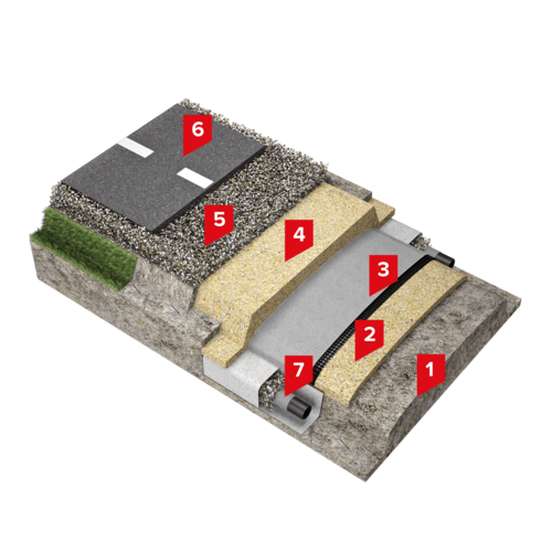 Данная система состоит из нескольких слоев асфальтобетонного покрытия с применением в качестве вяжущего ВДПБ ТЕХНОНИКОЛЬ. Слои финишного покрытия укладываются на щебеночную подушку. Основной слой дорожной одежды формируется песчаной подушкой. Для защиты основания дороги от увлажнения устраивается дренажный и капиляропрерывающий слой из дренажного геокомпозита ПЛАНТЕР 2Д. С целью сокращения сроков монтажа рекомендуется применять материал с шириной рулонов 4 метра. Устройство подкюветного дренажа из перфорированной дренажной трубы с фильтрующим слоем из геотекстиля повышает эффективность работы водоотводящей системы. Данное техническое решение не имеет ограничений по высоте и может применяться во всех климатических зонах Российской Федерации по СП 131.13330.2020.