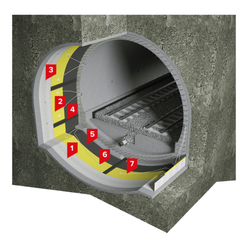 Однослойная ремонтопригодная система для гидроизоляции тоннеля, сооружаемого методом НАТМ, служит для защиты от напорной воды и обеспечивает возможность восстановления водонепроницаемости на весь период эксплуатации. В качестве гидроизоляционного материала применяется полимерная мембрана LOGICBASE V-SL с сигнальным слоем, изготовленная на основе пластифицированного поливинилхлорида (ПВХ).