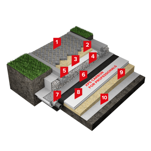 Система утепленной дорожки с водоотведением для благоустройства придомовой территории. Теплоизоляция обеспечивает стабильность дорожки в течение смены сезонов, а дренажная мембрана обеспечивает водоотведение. Система рассчитана на пешеходные нагрузки.