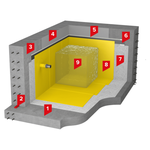 Система разработана для внутренней гидроизоляции резервуаров, предназначенных для хранения воды и технических жидкостей. В качестве гидроизоляционного материала применяется полимерная мембрана LOGICBASE V-SL с сигнальным слоем, изготовленная на основе пластифицированного поливинилхлорида (ПВХ). Особенности системы:  высокая скорость монтажа за счет технологии свободной укладки однослойной мембраны;  высокая прочность сварных швов;  свободная укладка гидроизоляционного материала без адгезионного сцепления;  монтаж с применением автоматического оборудования. Монтаж системы состоит из последовательной укладки подстилающего слоя из геотекстиля 500 гр/м2 и гидроизоляционной мембраны. Геотекстиль свободно укладывается на горизонтальную часть резервуара; на вертикальной части конструкции при высоте стены более 4-х метров выполняются промежуточные крепления при помощи полос из ПВХ мембраны. Соединение полотен гидроизоляционной мембраны LOGICBASE V-SL между собой осуществляется путем сварки нахлёстов горячим воздухом при помощи автоматического оборудования с образованием двойного шва и центрального воздушного канала, который позволяет контролировать герметичность швов. Возможно выполнение сварочных работ при помощи ручных фенов. Верхнюю часть мембраны LOGICBASE V-SL рекомендуется герметично приваривать горячим воздухом к ленте ПВХ LOGICBASE V-Strip FB, которая приклеивается к бетонной поверхности эпоксидным клеем ТЕХНОНИКОЛЬ. Допускается также механическое крепление верхнего края мембраны. Для изоляции верхней части резервуара, где нет изоляции из полимерной мембраны, рекомендуется применять полимерные композиции TAIKOR. Для герметизации технологических швов бетонирования в местах сопряжения плиты и стены применятся набухающий профиль ТЕХНОНИКОЛЬ IC-SP 20х10, установленный на набухающий герметик ТЕХНОНИКОЛЬ. Система наносится на бетонное основание и состоит из: - грунта TAIKOR Primer 210, который проникает в основание и обеспечивает упрочнение поверхности, образуя сцепной слой с последующими слоями системы; - одного слоя TAIKOR Elastic 300, который создают водонепроницаемое эластичное покрытие с высокой адгезией к основанию. Влажность основания для устройства изоляционной системы не должна превышать 4-х процентов.