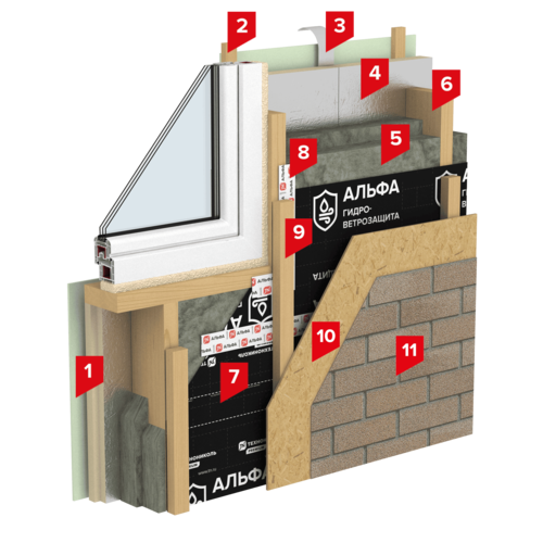 Оптимальным образом подобранные в результате температурно-влажностного расчета, толщины утеплителей позволяют сохранить незаполненным вентиляционный зазор в наружной части каркасных стоек. Это позволяет исключить из системы контрбрус, и дополнительную подконструкцию, традиционно присутствующую в стеновых ограждающих конструкциях, выполненных по принципу вентилируемого фасада без ухудшения качества омывания деревянных конструкций и утеплителя приточным наружным воздухом.