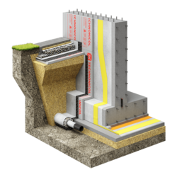 Ремонтопригодная система изоляции подземных конструкций с двухслойной гидроизоляционной полимерной мембраной LOGICBASE, утеплением и дренажом