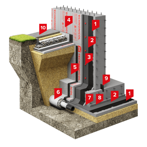 В качестве теплоизоляционного слоя подземной части здания используется экструзионный пенополистирол ТЕХНОНИКОЛЬ CARBON PROF, который крепится к гидроизоляционной мембране на специальный крепеж ТЕХНОНИКОЛЬ №01, мастику ТехноНИКОЛЬ №27 или клей-пену ТЕХНОНИКОЛЬ PROFESSIONAL. Также экструзионный пенополистирол выполняет функцию защиты гидроизоляционной мембраны от механического воздействия.