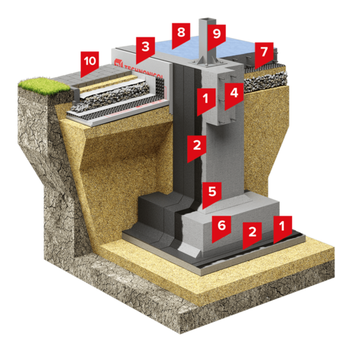 Система применяется для защиты сборных или монолитных подземных конструкций быстровозводимых каркасных зданий в промышленном и гражданском строительстве, а также ленточных фундаментов.