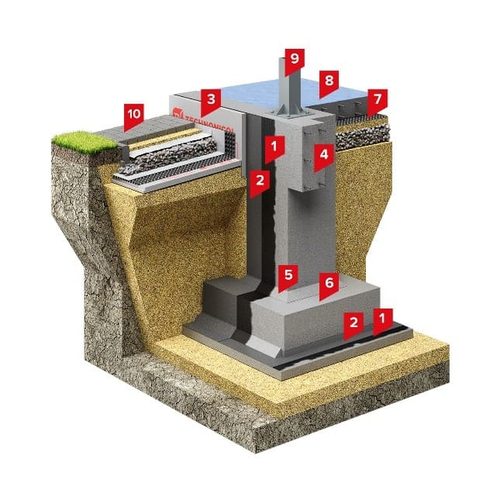 Система применяется для защиты сборных или монолитных подземных конструкций быстровозводимых каркасных зданий в промышленном и гражданском строительстве, а также ленточных фундаментов.