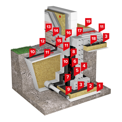 В качестве гидроизоляции применяется мастика ТЕХНОНИКОЛЬ № 21. В случае повышенных требований к гидроизоляционному слою или проектного решения возможно применять материалы: рулонные битумно-полимерные наплавляемые материалы (Техноэласт ФУНДАМЕНТ ТЕРРА, Техноэласт ФУНДАМЕНТ), либо самоклеющийся битумно-полимерный материал гидроизоляция Фундамента ТЕХНОНИКОЛЬ.