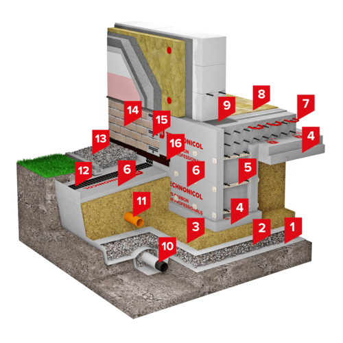 В качестве теплоизоляционного материала для вертикальной части фундамента и отмостки используется экструзионный пенополистирол марки ТЕХНОНИКОЛЬ CARBON ECO, который обладает низким водопоглощением и высокой прочностью на сжатие. Под подошвой фундамента и в конструкции пола используется экструзионный пенополистирол марки ТЕХНОНИКОЛЬ CARBON ECO SP, обладающий повышенными прочностными показателями. Технология несъемной опалубки с применением экструзионного пенополистирола XPS ТЕХНОНИКОЛЬ CARBON ECO и модульных элементов стяжек для несъемной опалубки позволяет выполнять фундаментную ленту необходимой ширины под любой тип стен. Технология позволяет производить бетонирование в одну захватку, сокращая временные затраты и количество технологических операций при возведении фундамента.