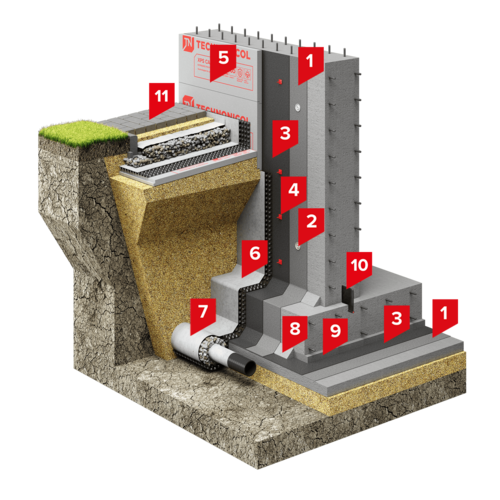 В качестве гидроизоляционной мембраны применяется двухслойная комбинация битумно-полимерных рулонных материалов Техноэласт ФУНДАМЕНТ ФИКС (первый слой) + Техноэласт ФУНДАМЕНТ (второй слой). На горизонтальное основание Техноэласт ФУНДАМЕНТ ФИКС укладывается свободно со сплавлением швов. Второй слой полностью наплавляется по первому слою. На вертикальной поверхности Техноэласт ФУНДАМЕНТ ФИКС крепится к основанию алюминиевой прижимной рейкой ТехноНИКОЛЬ ЭКО 2,0 или круглыми тарельчатыми держателями ТехноНИКОЛЬ, которые перекрываются вторым слоем.