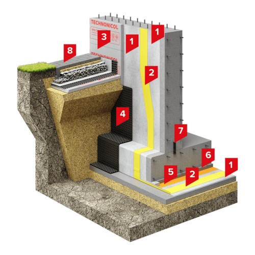 В качестве защиты гидроизоляционного слоя от повреждений при обратной засыпке применятся профилированная мембрана PLANTER Standard. Для герметизации технологических швов бетонирования в местах сопряжения плиты и стены фундамента применятся специальная ПВХ Гидрошпонка ТЕХНОНИКОЛЬ IC-125-2-SP 4D. Обустройство утепленной мягкой отмостки ТЕХНОНИКОЛЬ позволяет эффективно отводить атмосферную воду от сооружения и не допустить промерзания грунта.