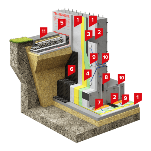 Для защиты гидроизоляции от повреждения при обратной засыпке применятся профилированная мембрана PLANTER Standard. Для герметизации технологических швов бетонирования в местах сопряжения плиты и стены фундамента применятся специальная ПВХ Гидрошпонка ТЕХНОНИКОЛЬ IC-125-2-SP 4D. Обустройство утепленной мягкой отмостки ТЕХНОНИКОЛЬ позволяет эффективно отводить атмосферную воду от сооружения и не допустить промерзания грунта.