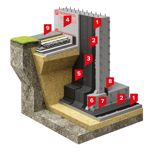 Для герметизации деформационных швов в данной системе применяются: Безосновный битумно-полимерный материал ТЕХНОНИКОЛЬ Флекс вместе с Гернитовыми шнурами ТН Фундамент; гидрошпонки марок: IM-260/50, IM-240/20, EM-260/20, EM-260/50, FM-140/50, FMR-140/50.